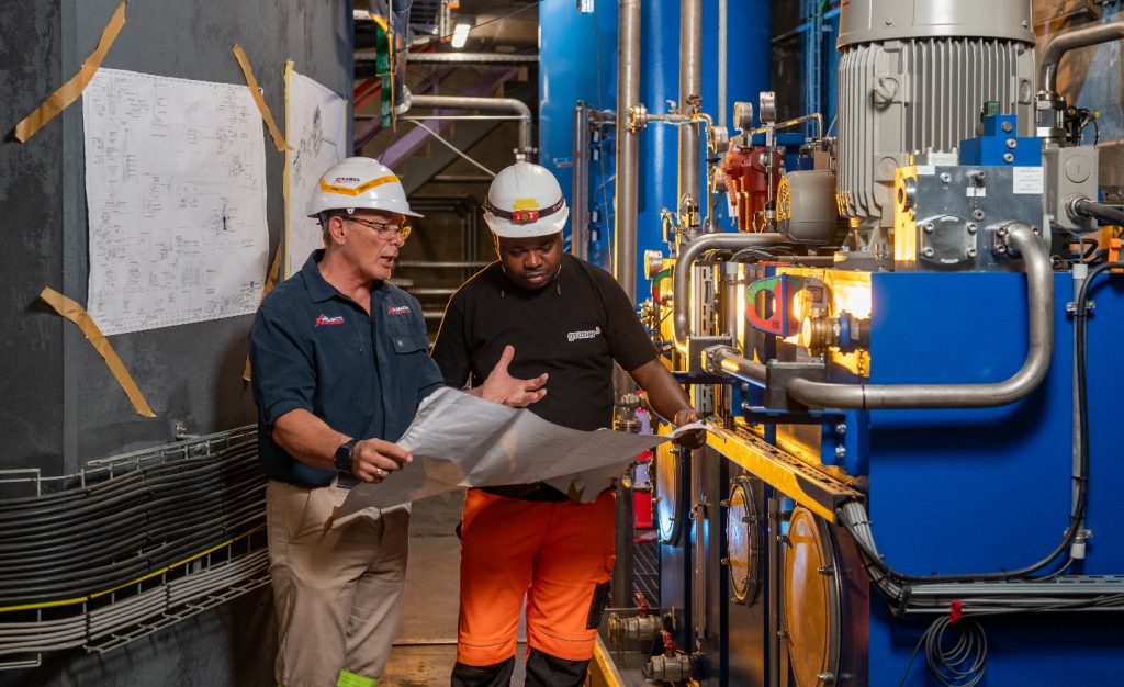 (De gauche à droite) Kasper Badenhorst, Responsable de la Construction chez Kamoa Copper, et Papy Enona, ingénieur en mécanique chez la firme Gruner Stucky AG, examinent les plans de la mise en service de la turbine no 5.